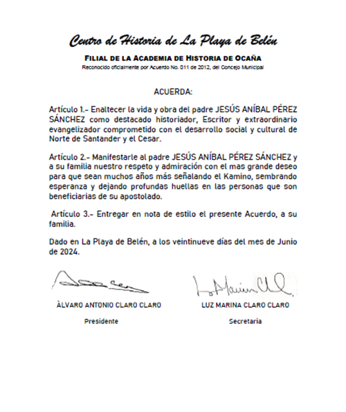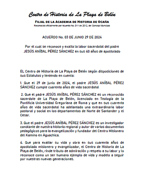 El Centro de Historia de La Playa de Belén se complace en registrar y celebrar los cuarenta años de sacerdocio del Presbítero JESÚS ANIBAL PÉREZ SANCHEZ, quien nació en la tierra de los Estoraques un 17 de julio de 1960.